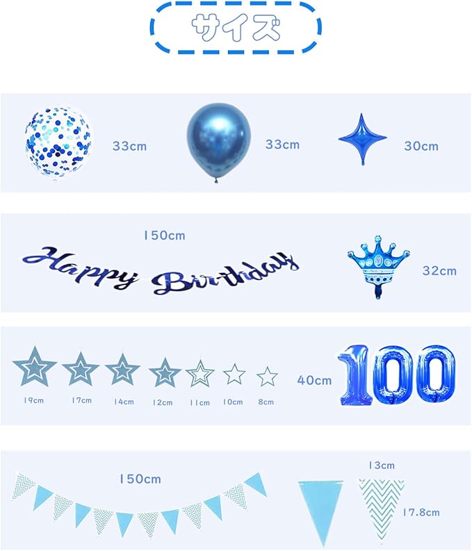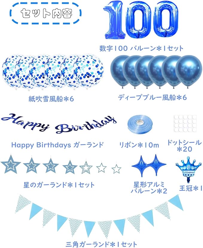 簡単カワイイ 華麗な感じ:セット内容:HAPPY BIRTHDAYガーランド 1組、星のガーランド 1組、フラッグガーランド 1組、数字バルーン「100」 1組(約40㎝)、クラウン風船 1個、ダイヤモンド風船 2個、ディープブルーゴムバルーン 4個、ディープブルー紙吹雪バルーン 6個、HAPPY BIRTHDAY TO YOU バルーン 1組、リボン(約10m) 1個、ドットシール(約20点) 1枚