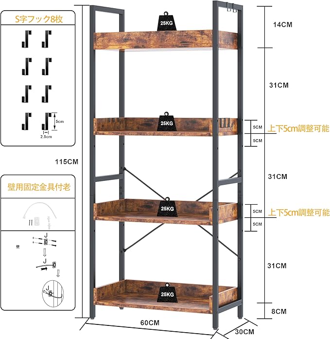 【サイズと調節性】このインダストリアルな本棚は、奥行30cm、幅60cm、高さ115cmのサイズで、各棚の高さ31cmが標準です。中央の棚は調節可能で、アイテムのサイズに合わせて自由にカスタマイズできます。