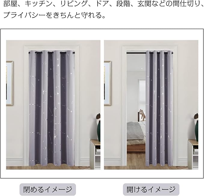 Topfinel のれん 間仕切りカーテン 断熱 カーテン 遮光 星柄 箔プリント 幅100cm 丈180cm 1枚入り グレー ハトメ型 突っ張り棒 カーテン 仕切りカーテン ドアカーテン 目隠し 玄関 キッチン リビング