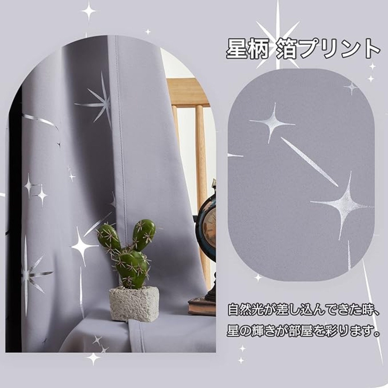 【生地】:箔プリントで星柄が綺麗なカーテン。光の当たり具合により箔プリントがキラキラ光って見えます。滑らかな100%ポリエステルの生地で、一年中にも使えます。