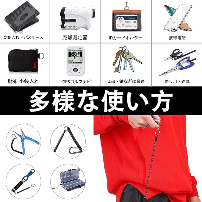 材質:カラビナはアルミ製 カールコードストラップはTPU材質,カニカン:亜鉛合金 チェイン+リング:鉄, 優れたTPU材質を使用しているため、断線や劣化防止に強い、長期間使用できます.何度も引いても回復スピードには問題ありません.