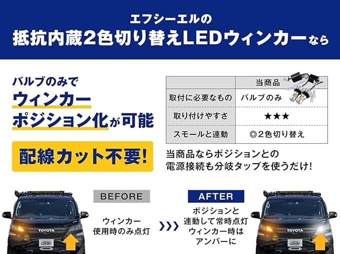 ■取り付け時の注意点:・抵抗器の追加は不要です。本製品は抵抗内蔵型のため、別途抵抗器を取り付けると過剰な電流により配線火災につながる恐れがあります。・車種によっては、ポジション線やテール線がバルブ近くにない場合があります。その際は、車内からの配線引き回しが必要になることがあります。・シーケンシャルウィンカーとの併用は、正常に動作しない場合があります。他社製品との互換性は保証できません。・CANシステムでランプを制御している車両(特に純正LEDポジション車)は、ヘッドライト部分から12Vポジション電源が取れない場合がありますので、事前にお車をご確認ください。・バルブ挿入口のサイズが合わないと、固定が緩み水分が侵入する可能性があります。必要に応じてシーリング材で防水処理を行ってください。・取り付け後、自動アシストやブレーキサポートなどの安全・快適装備機能が誤作動を起こす可能性があります。・直流車専用設計です。交流車には使用できません。・本製品はウィンカーの点滅回数(1分間に60~120回)に対応しています。点滅速度が保安基準を満たさない場合、ちらつきが見られることがあります。