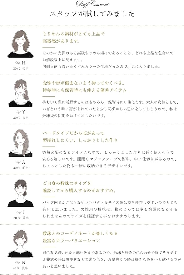 【ご注意】男女片手念珠用のサイズですが、大きい玉のものを入れる場合閉まりづらいことがあります。表地にレーヨンを使用しているため、水に弱く色落ちする可能性がございます。