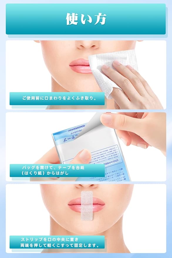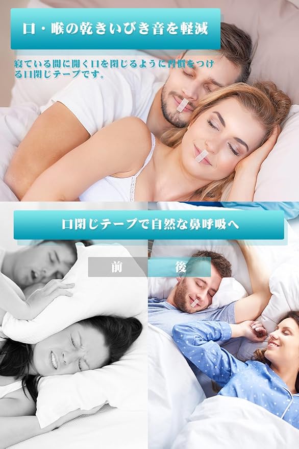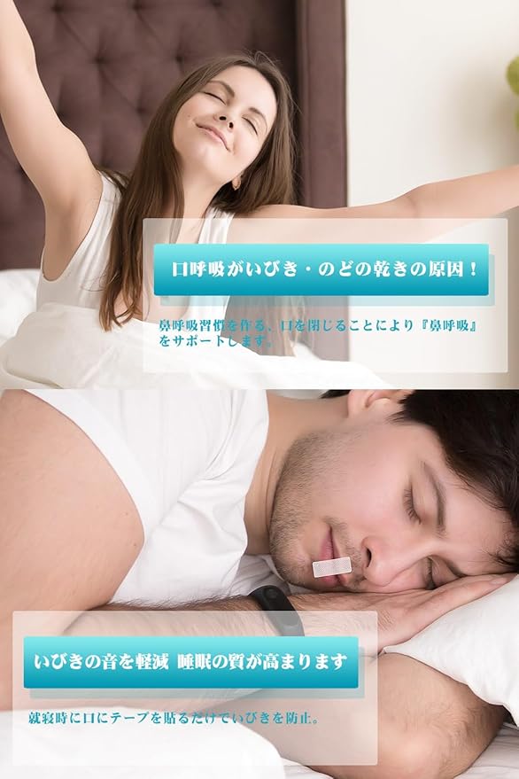 睡眠の質が高まりま:いびきをかく大きな原因の一つは口をあけて寝ることで口呼吸になることです。寝る前に口に貼るだけ口呼吸から鼻呼吸へ。起床時の口・のどの乾き、いびきの音を軽減し、睡眠の質が高まり。