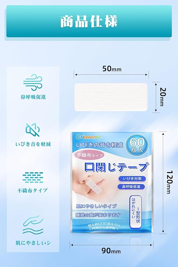 パッケージ内容:内容量60枚入り 4セット、材質:ポリエステル不織布、1枚サイズ:約20 50mm、口閉じを促し、鼻呼吸を習慣化、て爽やかで気持ちの良い朝を!(使い捨てなので、毎日新しいものをご使用ください。)
