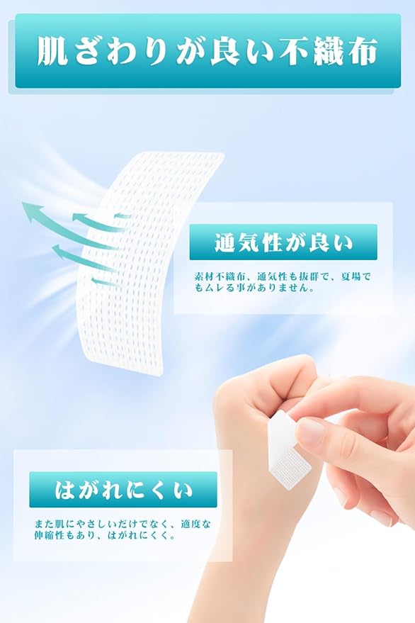 よい接着力です:不織布いびき防止テープ粘着力がほど良くて、夏場や汗をかきやすい時期でも快適にこ使用頂けます。ほど良い粘着力としっかりした材質で装着感が良い。剥がすのも痛くなく、跡が残るようなことはありません。