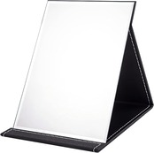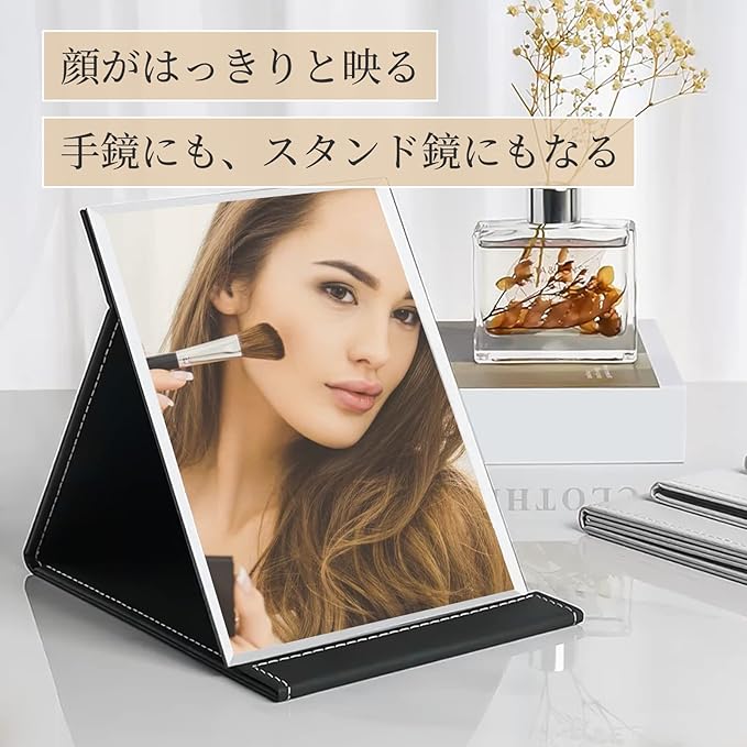 【スタンド付きのMサイズミラー】:21*15cmのコンパクトなサイズで、スタンドが付いています。置くだけで安定感があり、手を使わずに使うことができます。ブラックカラーのデザインはシンプルでスタイリッシュです。