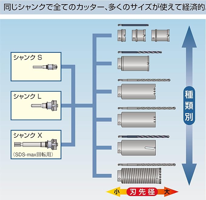 独自の刃先角度で振動ドリルの打撃力、回転力を有効に伝達。