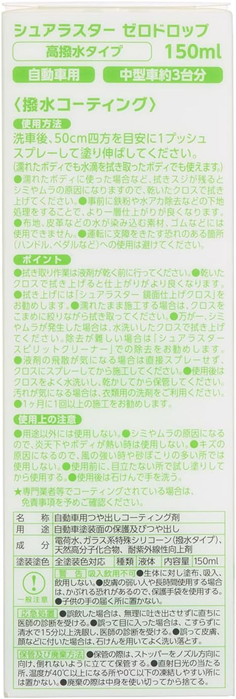 SurLuster(シュアラスター) ゼロドロップ 150ml 撥水 ガラス系コーティング 約2ヶ月耐久 艶 光沢 紫外線吸収剤 UV 保護 車 バイク 自転車 簡単施工 洗車 スプレーコーティング S-112 | etshop