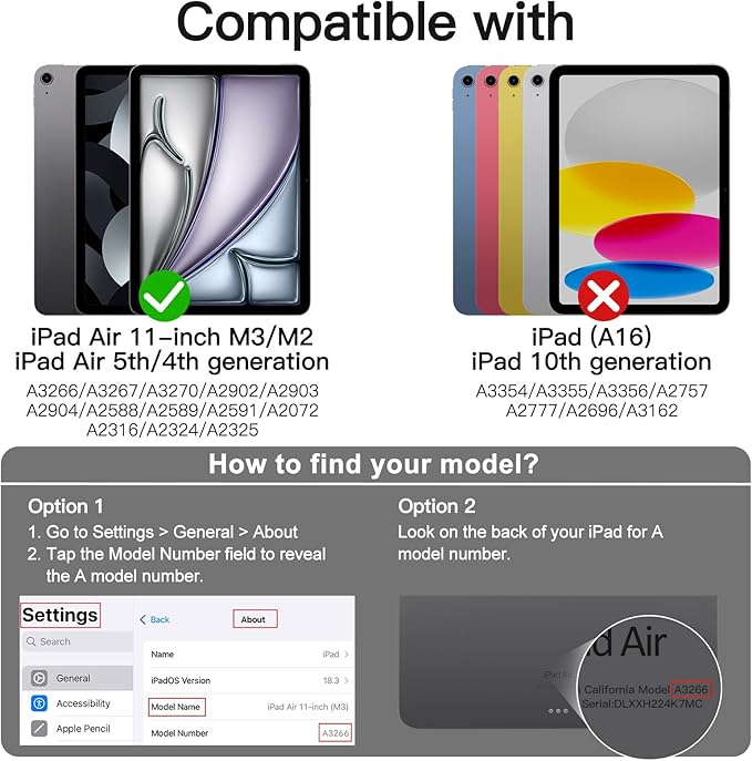 [互換性] Pencil Pro/Pencil(USB-C)に対応。iPad Air 11インチ M3/M2 (2025/2024) 、iPad Air5/4 2022/2020 10.9インチ専用iPad Air 5/4 保護ケース 用の特別デザインです。対応モデル:A3266 / A3267 / A3270 / A2902 / A2903 / A2904 / A2588 / A2589 / A2591 / A2324 / A2072 / A2316 / A2325。「設定」>「一般」>「情報」の順に選択します、「モデル番号」フィールドをタップしてAモデル番号を表示します