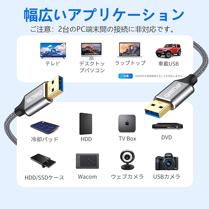 ✅【幅広い互換性】USB Aコネクタのパソコンと、USB機器(USB Aコネクタを持つ機種)を接続するUSB オスオス ケーブルです。USBケーブルは、タイプAポートを備えたハードドライブエンクロージャ、およびタイプAポートを備えたラップトップ、冷却パッド、スマートTV、車内USB、DVDプレーヤー、USBハブ、モニター、カメラ、ブルーレイドライブ、セットトップボックス、外付けハードドライブなどと互換性があります。