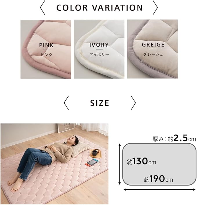 【サイズ】<130 190cm>約幅130 奥行190 厚さ2.5cm (約1.5畳) 【組成】表生地:ポリエステル93%、ポリウレタン7%(ベロア)/中材:ポリエステル100%、アルミシート/裏生地:ポリエステル100%(スリッド加工) 【カラー】グレージュ