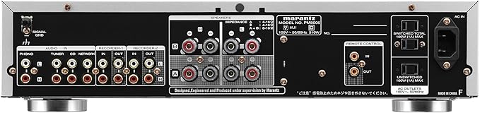 プリアンプ回路はオペアンプ(IC)を使用せず、フル・ディスクリート構成の電流帰還型増幅回路を採用。さらに圧倒的なハイスルーレートを誇るディスクリート・アンプモジュールHDAM -SA2 + HDAM -SA3を実装し、ハイスピード化と超高域にまで至る優れたチャンネルセパレーションを実現。オーディオ信号を内部で劣化させることなく忠実にパワーアンプに送り出す。フルディスクリートのパワーアンプには、新たにV / I サーボ回路を搭載。効率の良い的確な増幅を行い、ファイナルのトランジスターまで忠実にオーディオ信号を送り込む。ノイズを低減させるだけでなく、クラスを超えたスケール感を再現。そして、大型スピーカーを使用して音質検討を行ったうえで、音楽の隅々まできちんと再生ができているかを確認。ワイヤリング(配線の引き回し)やグランドポテンシャルなども慎重に調整・確認のうえ音作りを行い、電源一次のリレーサージ電流を大きなものに変更し音質を向上。また、バイアス回路の安定化を図り音の表現力を向上。コンデンサやトランジスタなど、音質に大きな影響与える回路部品の見直しを行い、オーディオ専用部品を多数使用。全ての音声入出力端子に金メッキピンジャックを採用。デザインは、マランツ伝統のシンメトリー(左右対称)レイアウト、3 ピースのフロントパネルからなり、左右の美しいラウンドフォルムのピースで、グラスファイバーを織り込んだダンピング効果のある材質でセンタ―のアルミパネルを支えて、デザインと音質を高い次元で両立。またオートスタンバイ機能を搭載し、音声の入力がない状態で30分間操作しない状態が続くと自動的にスタンバイ状態になり、無駄な電力消費を抑える。この機能は本体でのON / OFF の設定が可能。