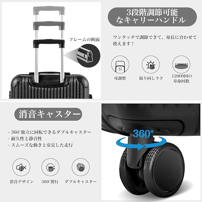 【多段階キャリバー&消音キャスター】スーツケースは超軽量アルミ製キャリバーを採用、頑丈で揺れ動きにくく、キャリバーの高さを2段階で自由調節できます。高弾性TPE衝撃軽減素材&360 独立回転できるダブルキャスターを採用し、スムーズな動きと安定した走行が可能となります。
