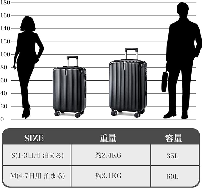 【ABSとPC&耐衝撃】Lサイズ約W50 D30 H76cm、三辺の和は156cm、容量は約99L、重量は約3.8kgです。キャリーケースの表面はPC(ポリカーボネート)を使用、そして、傷が目立ちにくいマットエンボス加工、高耐衝撃性を持ち、高弾性で、変形しにくいです。中央は高品質ABS樹脂を使用、防水性、耐摩耗性を備えています。