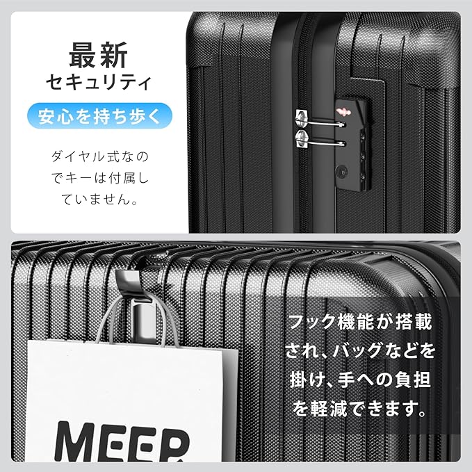 [meer] スーツケース 超軽量 キャリーケース キャリーバッグ 隠しフック機能 360度回転 耐衝撃 静音 TSAローク搭載 泊まる ファスナー式 ビジネス 修学旅行 海外旅行 国内旅行 小型 出張 (ブラック, Lサイズ) | etshop