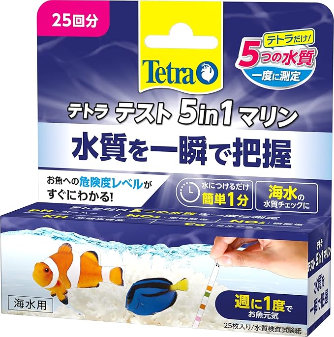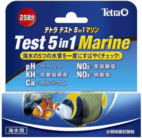 海水魚の飼育で重要なペーハー、炭酸塩硬度、カルシウム、亜鉛酸塩、硝酸塩の5つの水質を一度にすばやくチェック出来る試験紙です。