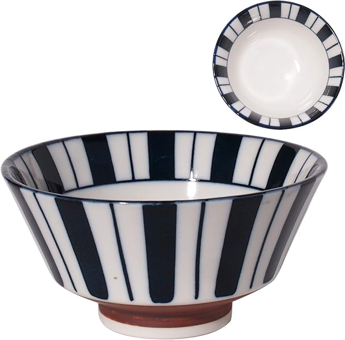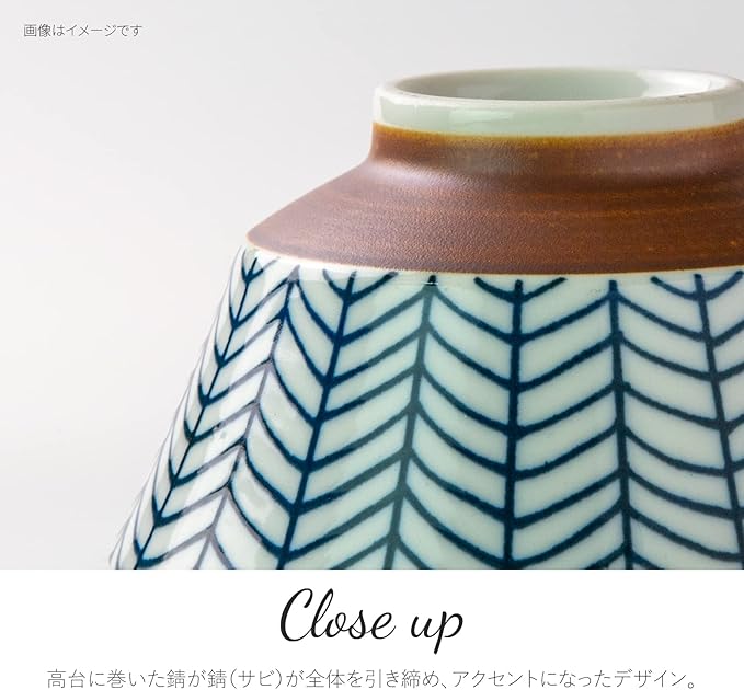 伝統的な和柄を呉須で描き、高台を茶色のサビで巻いたコントラストがモダンなデザイン。