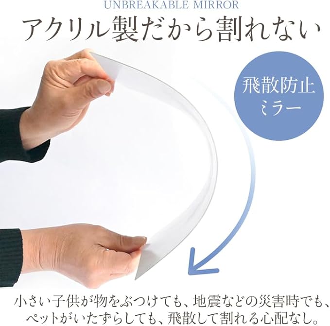 【安心安全割れない鏡】アクリル製の鏡ですので、落下しても飛び散ることもなく、地震や自然災害の発生時に、割れる危険もございません。穴あけ不要で簡単貼付けタイプですので賃貸に住まわれてる方や、保育園やダンス、ゴルフのスイング練習にも最適です!