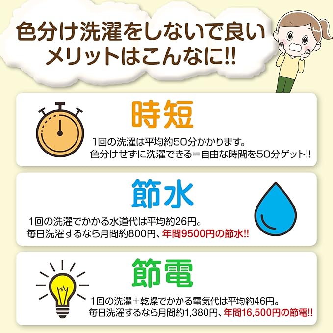 ✅【使用用途】洗濯時の色柄物から色移り、くすみを防止します。色分け洗濯をする必要がないため時短、節電、節水効果が見込めます。また、しみ抜きの為に手洗いする際に一緒に入れることで、滲み出たしみが再度洋服に付着してしまうのを防ぎます。