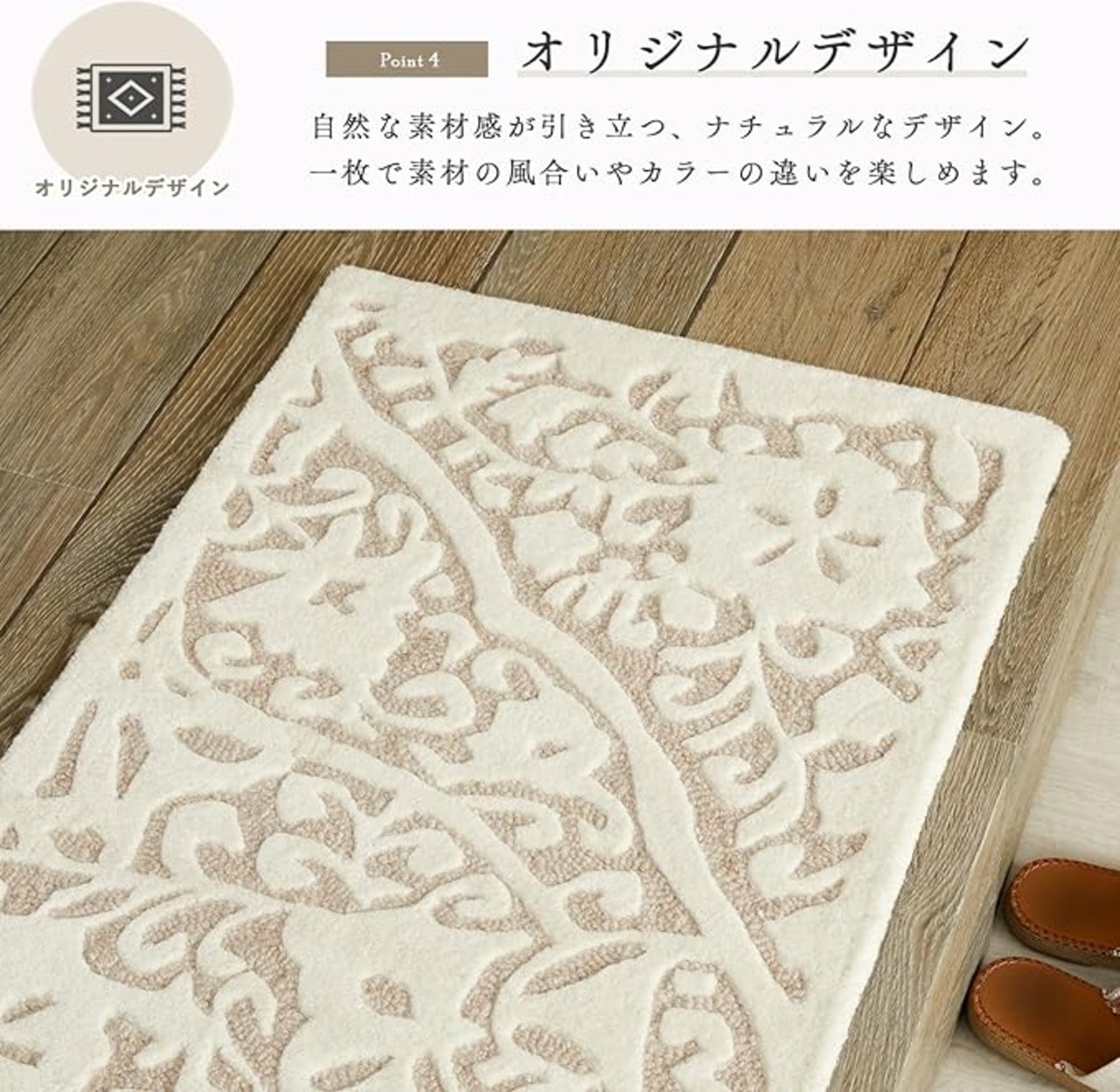 【ウール100%】ウールは他の繊維に比べて汚れにくいのが特徴です。また、静電気が発生しにくいので、ホコリがつきにくく、遊び毛による自浄作用があるため、毎日の簡単なお手入れでいつも綺麗にお使いいただけます。他の素材に比べて吸湿性が高い天然素材は、吸った湿気を放出し、1年を通してムレにくく、サラッとした肌触りを楽しめます。静電気も起こりにくく、乾燥する季節でも使うことができます。そんな天然素材を立体的な幾何学デザインで、贅沢に仕様したラグとなっています。