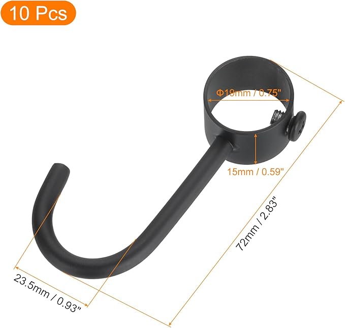 [製品パラメータ] - パイプロッドフック - 内径: 19mm/0.75インチ; パイプライン幅: 15mm/0.59インチ; フックの長さ: 72mm/2.83インチ; パッケージ: 10個。内径幅を調整するための調整可能なネジが付属しています。