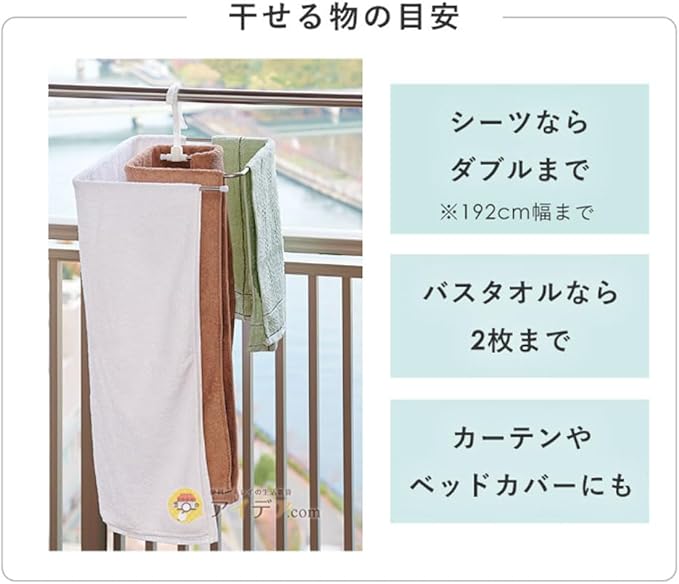ダブルシーツまで干せる!(※幅192cmまで対応) バスタオルなら2枚、カーテン・ベッドカバーも干せる。耐荷重(約)/4㎏
