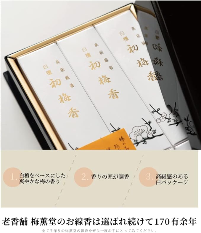 【 包装 蓮のし付き 】梅薫堂 白檀初梅 6箱入 【塗箱】/「心を穏やかにする白檀の香り。大切な人への贈り物に最適なギフト線香。」 日本製 国産 淡路島 ばいくんどう 線香 御香 お香 御供 お供え物 ギフト 進物用 贈り物 贈答用 セット ご霊前 ご仏前 お悔やみ お盆 お彼岸 初盆見舞い 仏壇 仏事 喪中 葬儀 法事 法要 香り 供養 遺族 びゃくだん はつうめ(普賢堂仕様) | etshop
