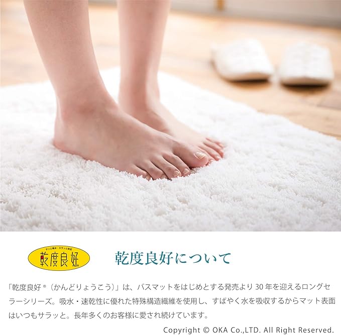 吸水速乾性に優れた「乾度良好」の糸を使用したタオルのように気軽に洗えるバスマット「カララカ」。他の洗濯物と一緒に洗濯できて乾燥機も使えます。だから忙しい毎日でも乾きが早いから洗いたいときにお洗濯ができます。発売より30年以上のロングセラー「乾度良好」の繊維を使用しているので吸水性、速乾性に優れ洗濯後の脱水した時点で「乾いている」と感じられるほど。また繊維上の細菌の増殖を抑える抗菌防臭加工がされているので家族が多いご家庭でも安心してご使用いただけます。