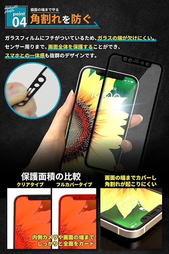 【角割れ防止】ガラスフィルムにフチが付いているため、ガラスの端が欠けにくく、センサー周りまで、画面全体を保護することができます。スマホとの一体感も抜群のデザインです