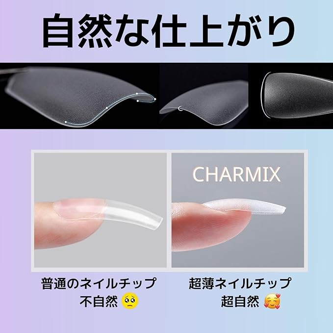 【CHARMIXネイルチップの特徴】 1.サンディング済み仕様:装着前のサンディング手間を省き、すぐに使える便利さが魅力です。 2.薄型&極薄デザイン:まるで自爪のようなナチュラルな仕上がりを実現。長時間つけても違和感がありません。 抜群のしなやかさと強度を兼ね備えているため、曲げても元通りの形状をキープ。 3.豊富な種類:バレリーナ、アーモンド、オーバル、ラウンドなど一番人気なデザインがお揃い。 4.豊富なサイズ展開:ショートからミディアム、ロング、ハーフチップまで、さまざまな爪の形状や長さに対応。