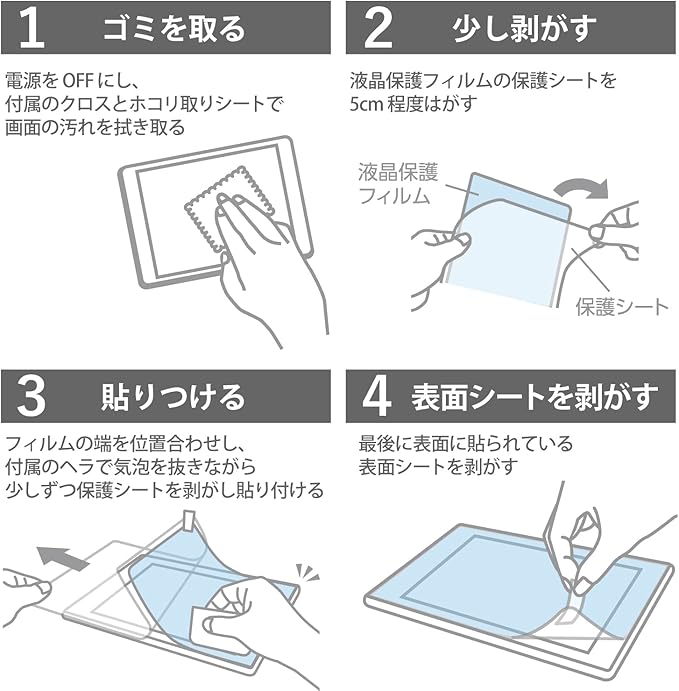 ■セット内容:液晶保護フィルム(エアーレス反射防止仕様) 1、ホコリ取りシール 1、クリーニングクロス 1、ヘラ 1