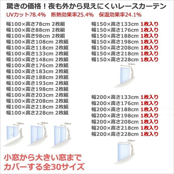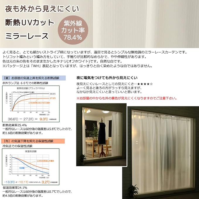 シンプルな無地調のミラーレースカーテン。トリコット編みという編み方をしていて、手触りが比較的なめらかです。色は元の糸の色をそのまま生かしたキナリ(オフホワイト)です。※パッケージ上は「WH」表記となっていますが、はっきりと白く染めたような白ではありません。断熱効果率25.4%。一般的なレースの約1.6倍前後のの断熱効果。保温効果率24.1%。一般的なレースの約4.5倍の保温効果。夜見えにくいレースとしての見えにくさ…★★★★☆よく見ると後ろの方がうっすら見えますが、なかなか見えにくいと言っていいと思います。※お部屋の中からも外の景色が見えにくくなりますので、ご注意下さい。UVカット率78.4%:夜見えにくいレースとしては若干低めで、80%を切りますが、この価格でUVカット80%近くというのはかなりお買い得だと思います。商品画像は幅100 高さ176cmの写真です。カーテンレールは付属しません。◆お使いのモニターや環境によって色の見え方が異なりますのであらかじめご了承下さい。