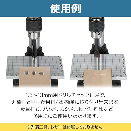 1.5~13mm用ドリルチャック付属で、丸棒型と平型菱目打ちが簡単に取り付け出来ます。