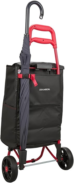 折り畳めてコンパクトに収納できるショッピングカート。保冷機能付きなのでお買い物に便利。お店のカートに取り付けられるフックや収納ポケット多数、傘立てなど機能充実。