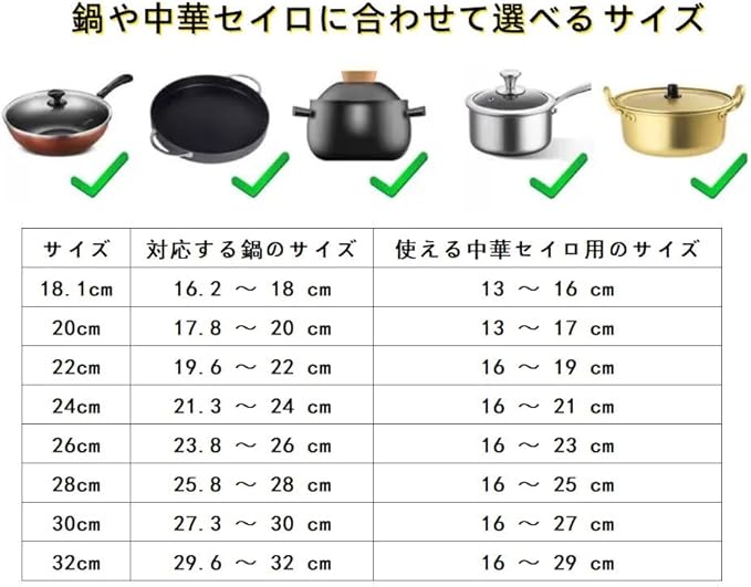 【せいろ蒸し器 - サイズ】小さめの20cm~サイズの32cmまで対応しているので、使いたいせいろの大きさと家にある鍋の大きさなどを参考にしながら、ぴったりなサイズの蒸し板をお選びください。