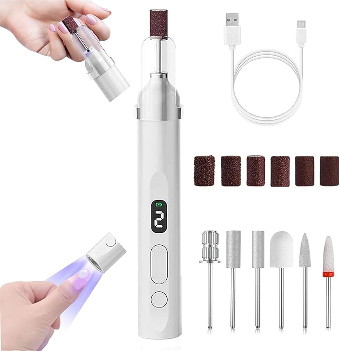 【多機能爪切りセット】電動爪ヤスリセットの頭部には自動LEDライトがあり、尾部にはUVネイルライトがある。6種類の異なる爪ドリルと研磨テープがあり、3種類の異なる速度で爪の手入れ、爪の剪定、爪の研磨、アクリル爪の除去、ジェル爪と粉状爪の除去に使用できます。 【ワイヤレスと充電】携帯に便利、充電可能、コードレス電動ネイルドリルは180 mAh電池を内蔵し、充電2時間後にコードレスで1-1.5時間使用でき、しかもUSBケーブルを使用するだけで充電できる。 【UVランプ設計】ドリルの反対側にUVランプを設置し、60秒後に自動的に消灯するように設計しました。道具を変えずに爪を乾かすことができ、日常旅行の手伝いになります。コンパクトで持ち運びしやすく、友人や家族と一緒に自宅でDIYするのに適しています 【低騒音、低カロリー】電動爪緩衝器は人体工学設計を採用し、握りやすい。強力で静かなモーターがあり、放熱量が低い。爪切りドリルを使用するときは騒音が低く、カロリーが低く、振動が小さく、快適な爪のDIY体験をもたらします。 【包装】USBケーブル1本、爪切り6個、研磨テープ6個を含み、研磨、研磨、彫刻、天然アクリル爪除去、ゲル甲油浸粉、角質層などのほとんどの用途に適している。