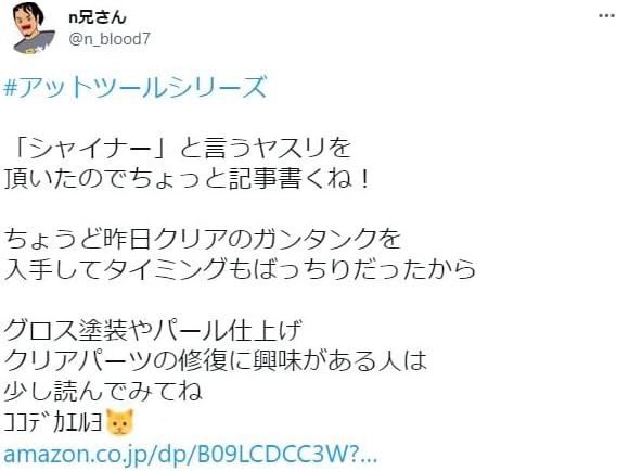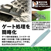 【ゲート処理も楽々】ゲート跡の成型後に、シャイナーの緑面で磨くことで綺麗に整えることができます。つや消し仕上げとする場合は、この時点で作業は完了。さらに白い面でヤスリがけをするとつるつるの鏡面に仕上がり、塗装無しでもきれいにゲート跡が処理できます。