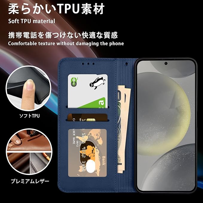 【適用機種】Samsung Galaxy S24 (SC-51E SCG25)専用ケース に対応なので。※購入前に対応機種をご確認よろしくお願い致します。外部のカバーは高級感が溢れるPU合皮を採用して、肌触りがよくて耐久性もよく、あらゆる方向からの衝撃、しっかりと本体を保護してくれます。TPU素材を採用、柔軟性が高く着脱が簡単で変形しにくく、ベタつかず適度な柔らかさで触り心地が良い。