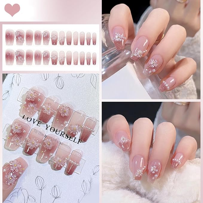 ネイルチップ ロング 付け爪 ネイルチップ 24枚入 和風 夢幻 キラキラ ネイルチップ ロング ピンク ギャル 光沢 花嫁ネイル 立体 蝶 3D付け爪 偽の爪 手作りネイルチップ 韓国 人気 おしゃれ ジェルネイル ネイルシール 成人式 結婚式 パーティー 女性 プレゼント (A32, 24枚入)