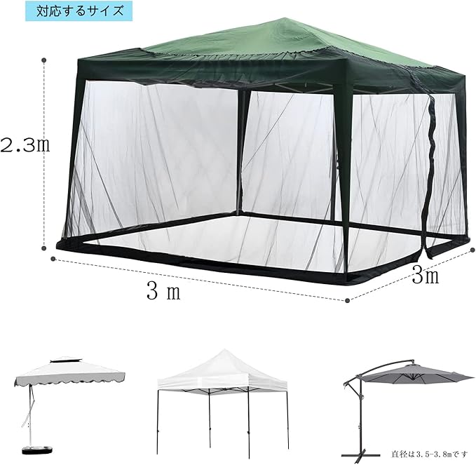 対応する傘のサイズ:正方形の傘の場合3x3m、円形の傘の直径の場合:3〜3.8m 蚊帳の周囲は12mで、あらゆる形状の傘に使用できます。