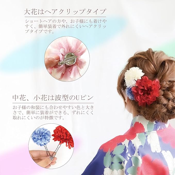 異なる種類・サイズを組み合わせることにより、奥行きとボリューム感のある仕上がり。1つ着けるだけでも華やかさがあり、複数使いでさらに存在感がアップします。大花はクリップ式になっているため、ショートヘアやアップスタイルでも簡単に装着できます。しっかり留まり、着崩れの心配がありません。中花・小花は波型のUピンを使用しており、髪にしっかりと固定されるため、長時間の着用でもずれにくく安心です。