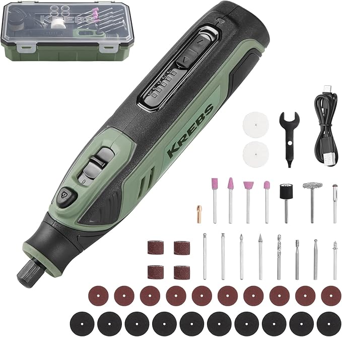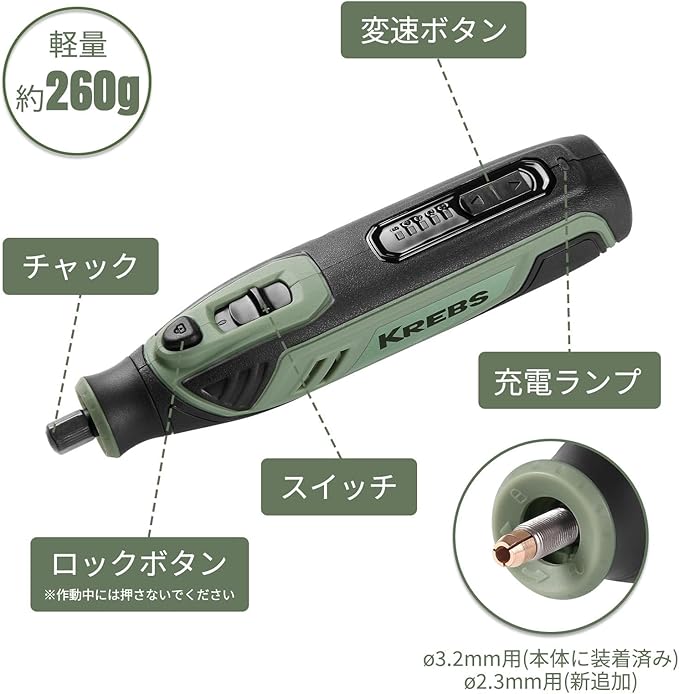 KREBS(クレブス) 充電ミニルーター(リューター)3.6V 2000mAh コードレス 軽量 5段変速 最高25000rpm ビット41点セット φ3.2/φ2.3コレットチャック 彫刻/研磨/切削/穴あけ/切断/サビ落とし/つや出し | etshop