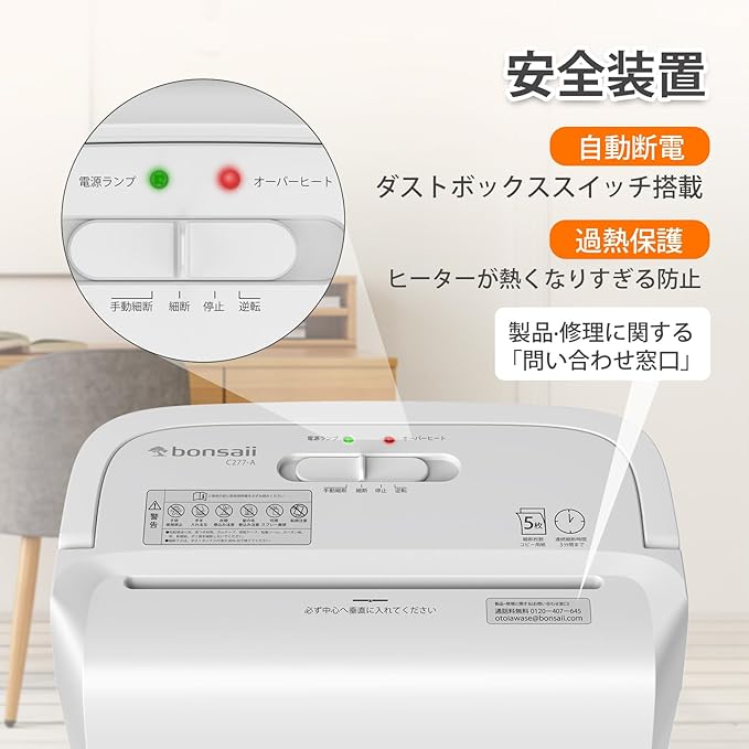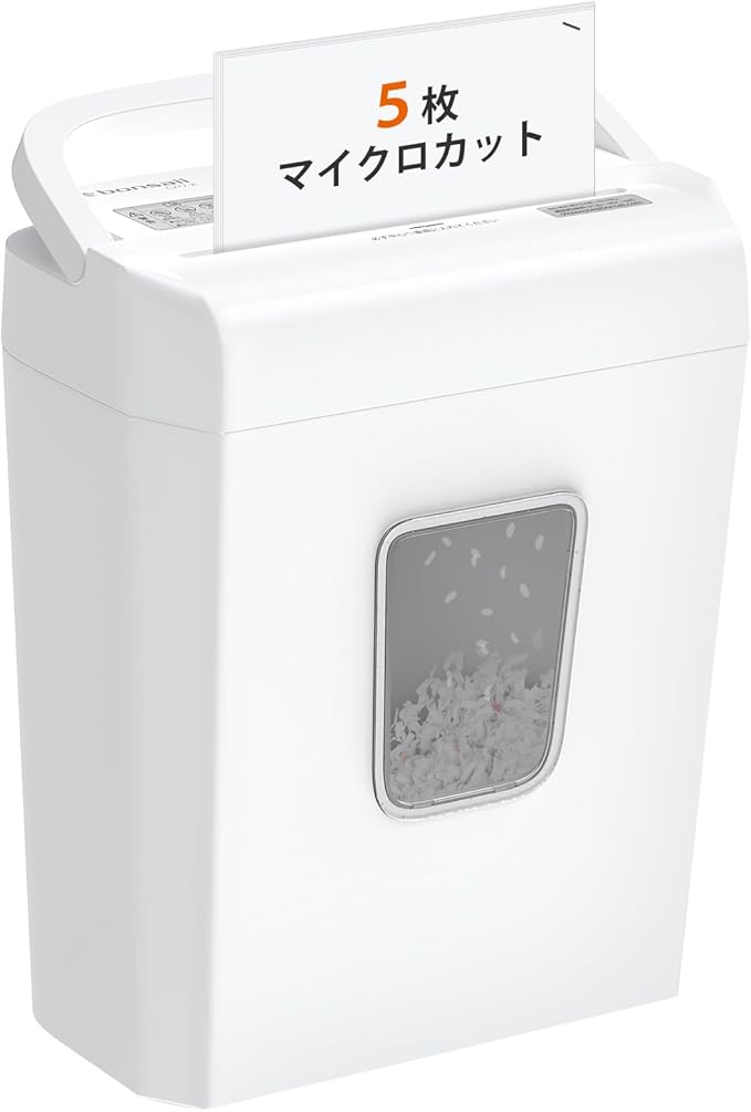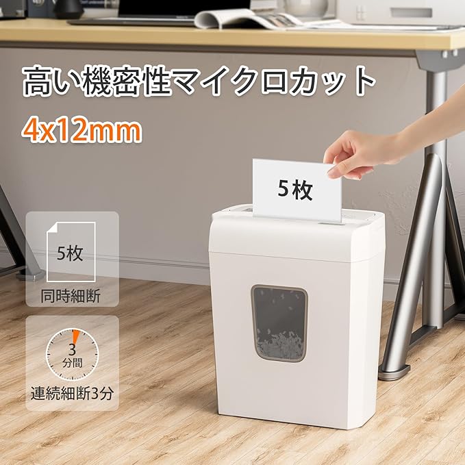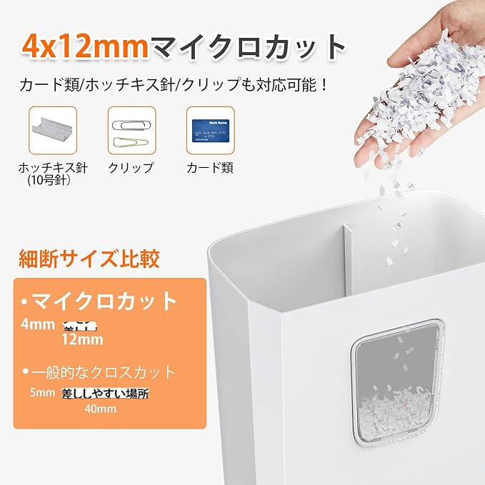 【マイクロカット&カード類対応】一度に5枚までの紙を4x12mmの小さな紙屑に細断でき、情報が読み取りにくく、重要情報の流出を防止します。ホッチキス/ゼムクリップ/カード類/プラスチックなし封筒もでラクラク細断します。