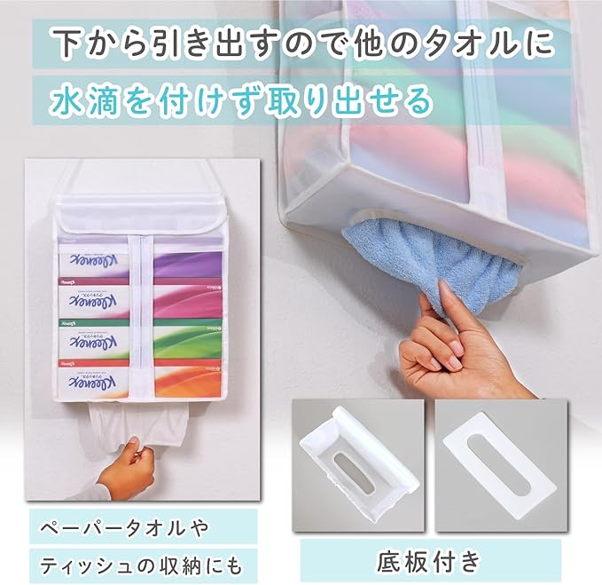 【中のタオルがほどよく透けて見える】:半透明で中のタオルがほどよく透けて見えるので、残りのタオルの枚数が分かる。ボックスティッシュやソフトパックティッシュの保管にもちょうどよいサイズ。