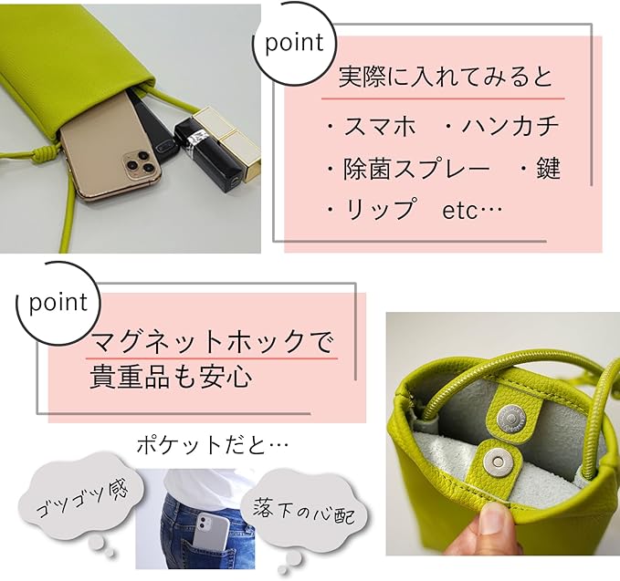 コーデを選ばないシンプルなデザインで、どんなスタイルにもマッチするスマホポーチ。肌馴染みの良いマットなフェイクレザーは傷に強く、デイリー使いにぴったり。軽量でスマホや鍵、ミニ財布がすっきり収まります。季節ごとのファッションに合わせて、差し色にもなるカラーバリエーションを楽しめます。