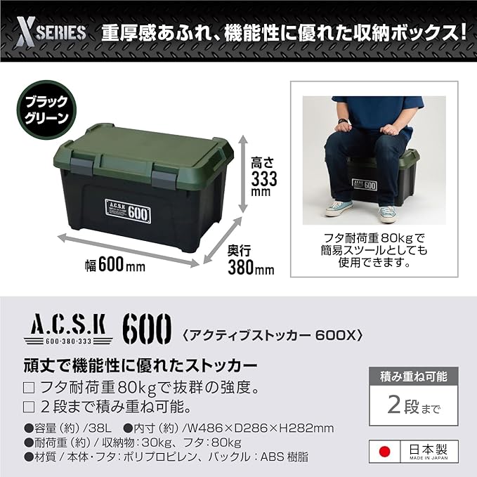 耐荷重が80kg(フタ)と非常に頑丈な作りとなっており、踏み台や椅子としても使用できる。
