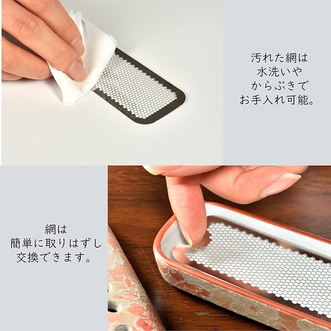 線香皿の中にセットされている網は特殊な構造になっており、お線香を寝かせても消えにくいつくりになっております。使い続けて網が劣化したときでも、替えの網を販売しているため、お気に入りの線香皿をいつまでも使うことができます。