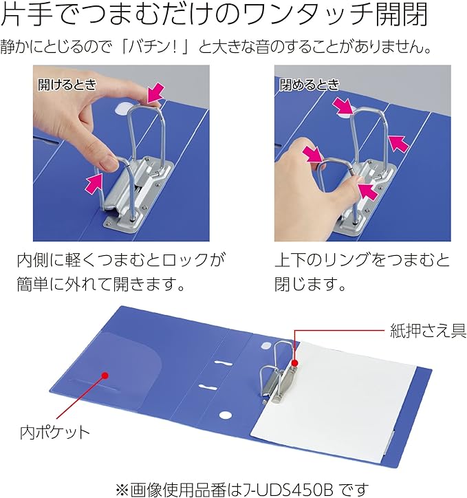 ・リングを内側に片手でつまむだけで開き、上下のリングをつまむと閉じることができます。