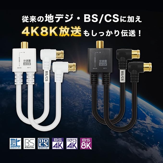 ■地デジ放送、BS/CS放送をそれぞれ視聴したいときはコレ! 地上波(UHF)と衛星波(BS/110度CS)を効率よく分け、1台のテレビで地デジ、BS、110度CS放送を視聴できます。 ■新4K8K衛星放送対応 従来の地デジ、BS、110度CS放送に加えて、最新の4K/8K放送にも対応しています。 ■ケーブル一体型構造 分波器本体と出力側ケーブルが一体型のつくりになっているため、分離型に比べて接続損失を軽減することが可能です。 ■便利なL字差込式コネクタ 狭い隙間での接続にはもちろん、テレビのアンテナ端子位置によっては、配線の露出を防ぐことができ非常に便利です。 ■BSアンテナ電源供給可能 【使用上の注意】 ご使用には入力用のアンテナケーブル(別売)が必要です。